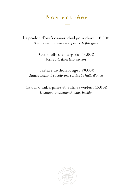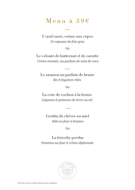 A la Terrade offre à ses clients une cuisine de grande qualité entièrement "fait maison", à base de produits frais uniquement et en majorité Bio et locaux, dans une ambiance agréable et conviviale.