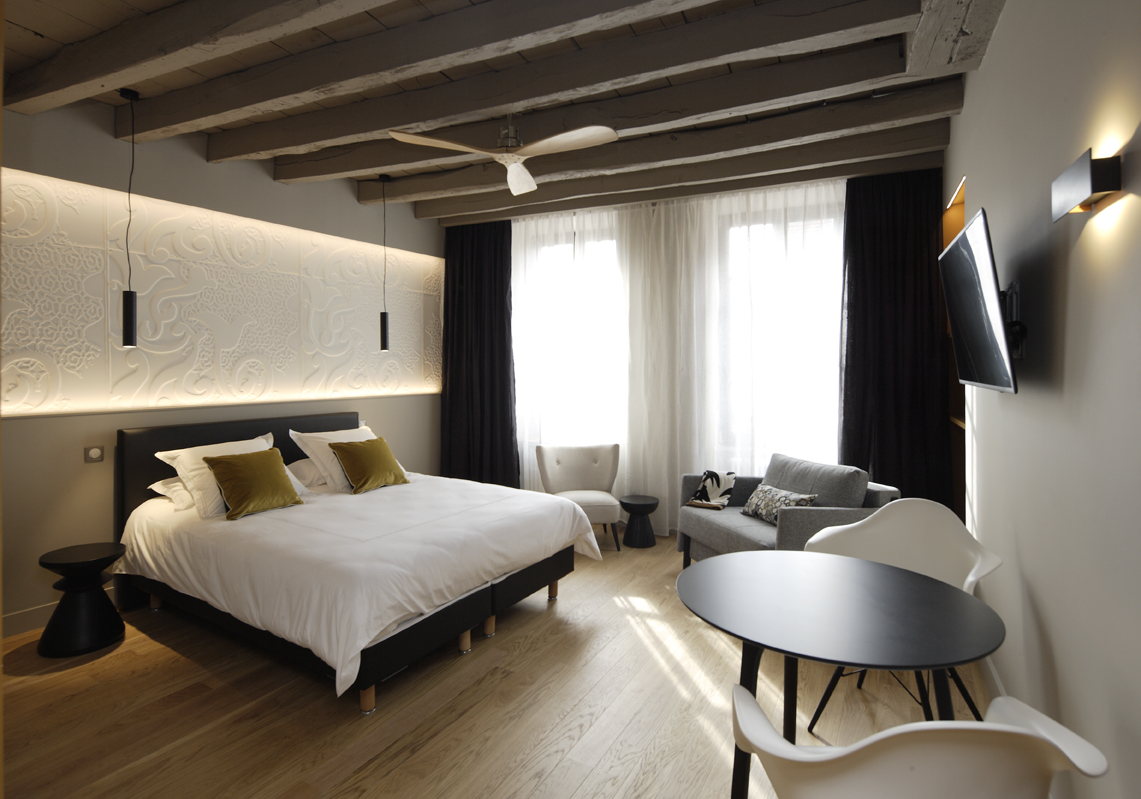 Suite # 13 located on the second floor of an 18th century building. Comfortable stairs to go up. It is decorated in contemporary style and furnished with designer furniture. Oak parquet floor.