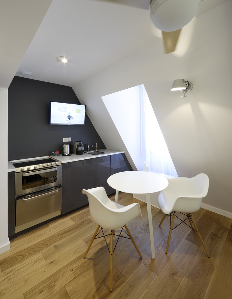 Kitchenette (fully-equipped with dishwasher, oven, refrigerator, crockery, etc), Nespresso coffee machine, wardrobe with storage and hanging space, desk, dining table with two chairs, king-size double bed (160cm), Smart TV with 32-in screen which will also receive radio. Free Internet access.