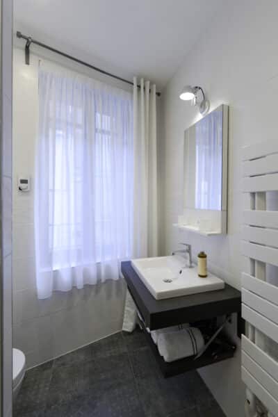 Suite No 9 is situated on the second floor of a 17th century building. Access is by the original stone spiral staircase. It is decorated in a contemporary style and furnished with designer furniture. The floorboards are oak.