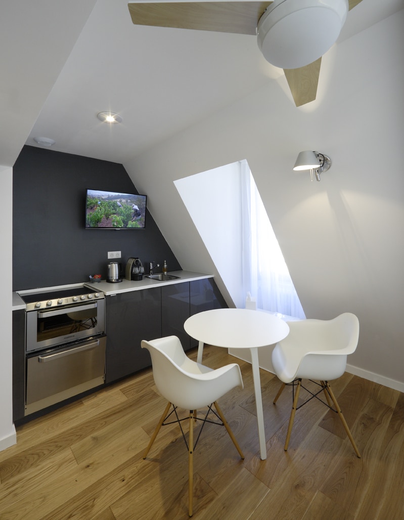 Chambre studio n°5 située au deuxième étage mansardé en bord de Creuse. Elle est décorée dans le style contemporain et meublée de meubles de designers. Parquet de chêne au sol.