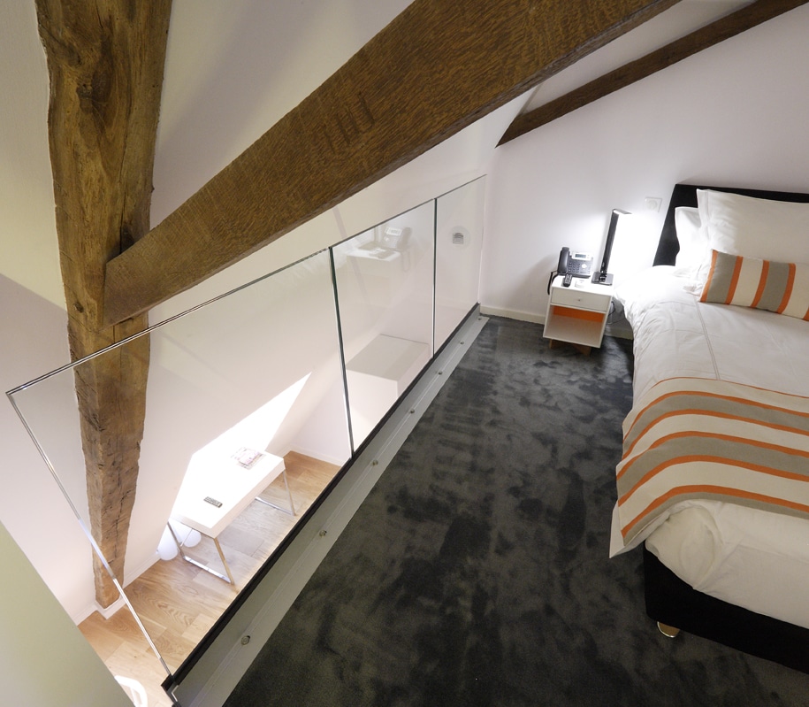 Chambre studio n°6 située au deuxième étage mansardé en bord de Creuse. Elle est décorée dans le style contemporain et meublée de meubles de designers. Parquet de chêne au sol, moquette épaisse dans la chambre.